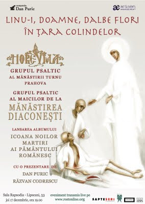 Concertul “Linu-i, Doamne, Dalbe flori în Ţara Colindelor” va avea loc la Sala Rapsodia, joi 17 decembrie de la ora 19:00 și va aduce în faţa publicului corul Psaltic Horevma al Mănăstiriea Turnu – Prahova, și corul Psaltic de maici de la Mănăstirea Diaconeşti – Bacău.