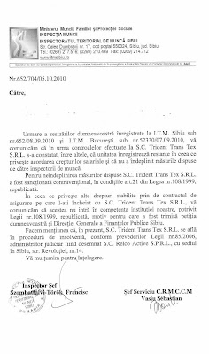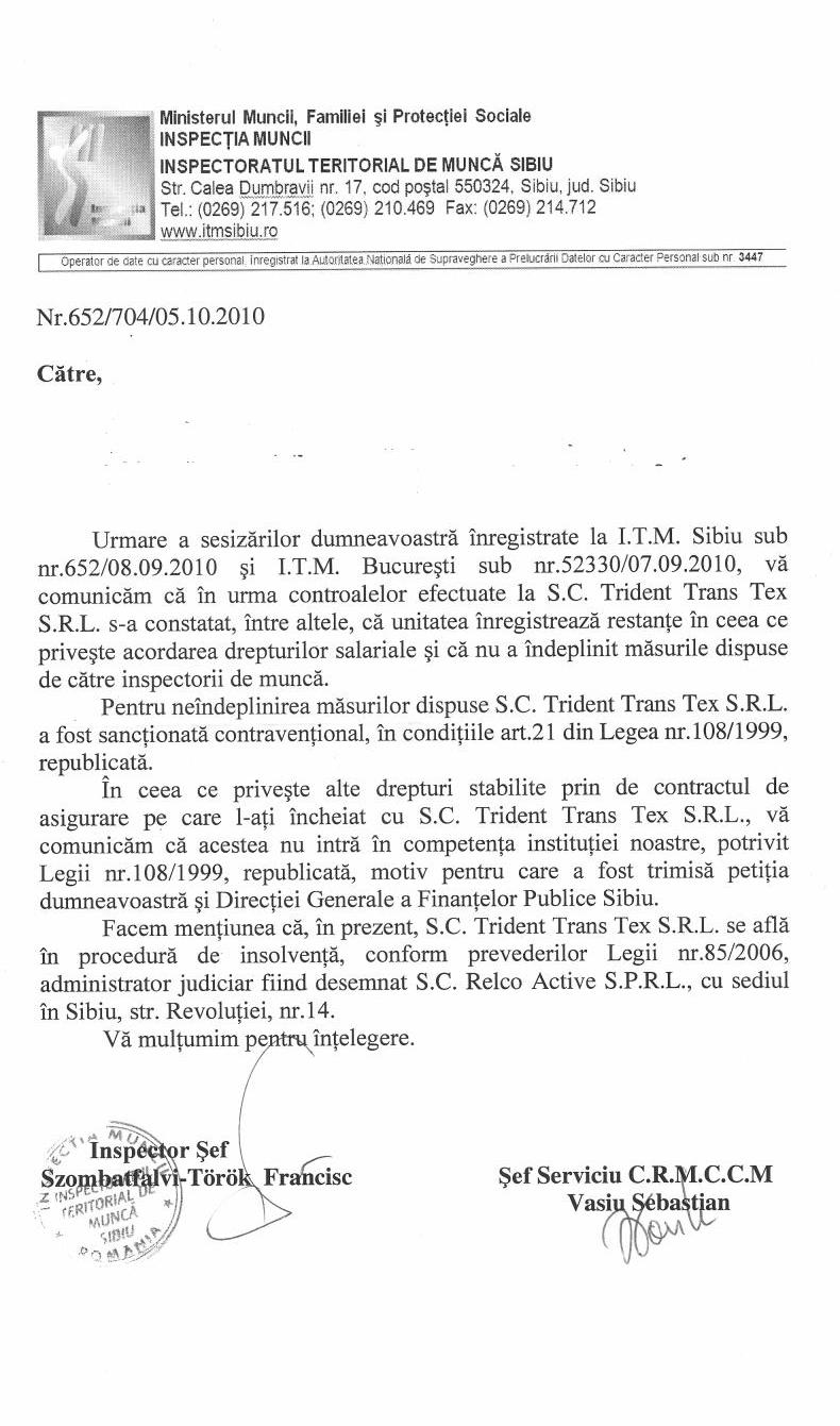 ITM Sibiu confirma, intr-un raspuns oficial in urma unei sesizari, faptul ca SC Trident Trans Tex SRL se afla in procedurra de insolventa, conform prevederilor Legii nr. 85/2006, fiind desemnat un administrator judiciar.